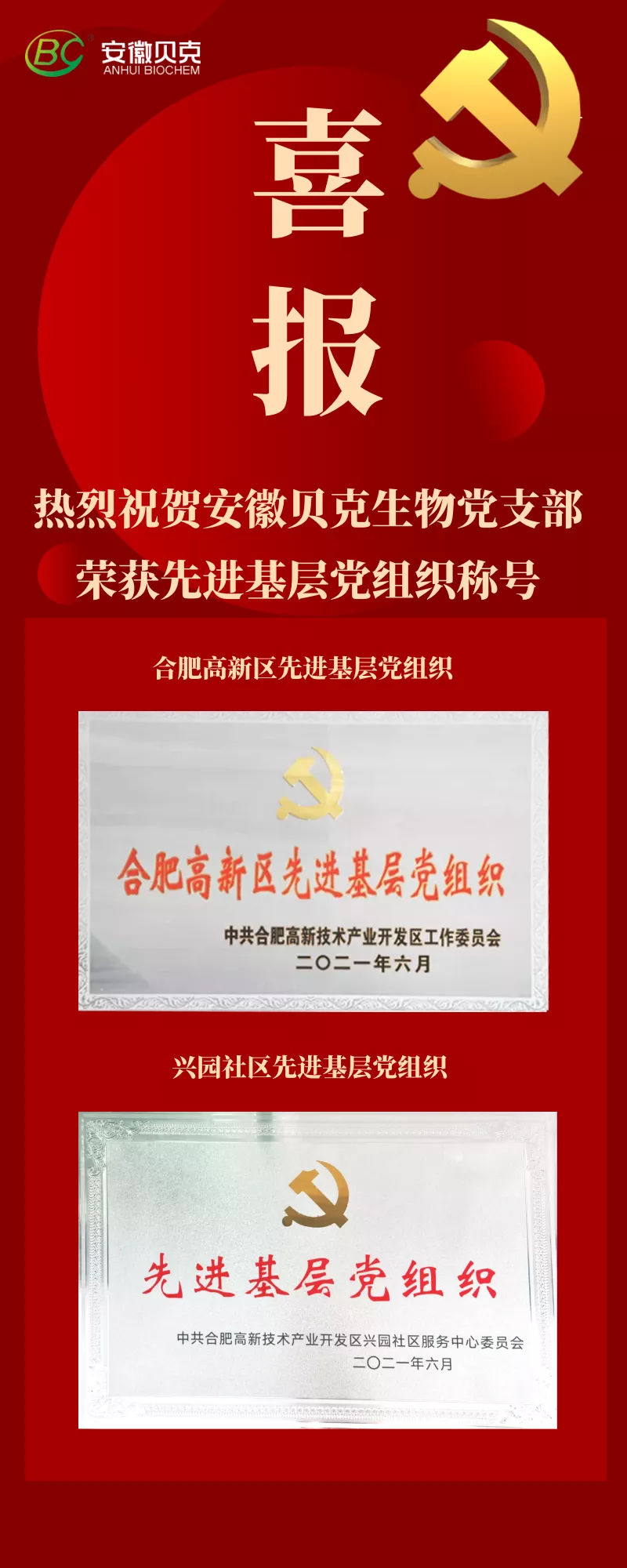 貝克生物黨支部榮獲合肥高新區(qū)、興園社區(qū)“兩優(yōu)一先”先進基層黨組織稱號